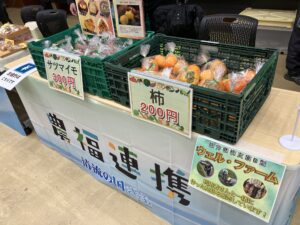 初めて参加させていただきましたが、畑チームから1名、室内チームから1名の利用者さんに手伝ってもらって弊社の畑で採れた富有柿・さつまいも(紅はるか)を販売しました。